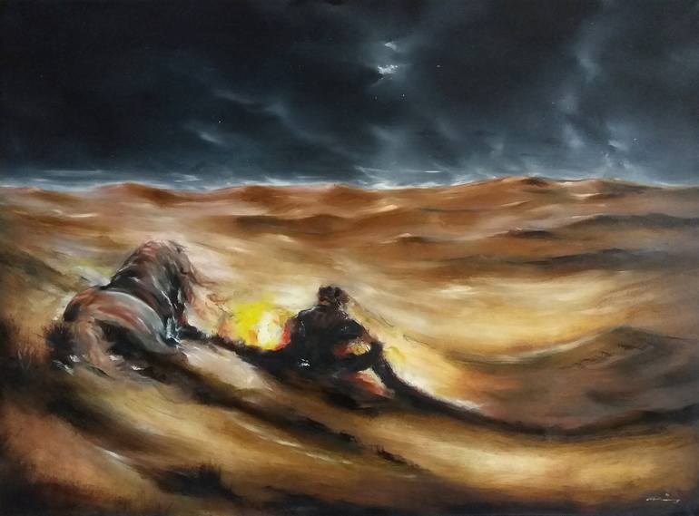 The painting "Warrior of the Peasant's Heart" was created as the idea of a peaceful village man forced into the role of a warrior. No matter how much evil is around him, war makes him hate people, but he cannot move away from loving the animal horse and the land around him. He seeks peace in retreat...