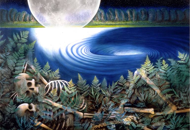 This is a painting concerning love and death. These two skeletons are relaxing after making love in the moonlight. It is quite romantic, don't you think so? I used real ferns to print the foreground.