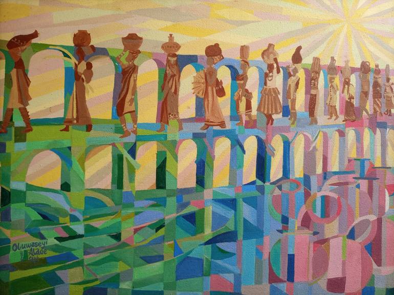 My panting: Carrying water Oil on canvas. 29cm x 39cm It is inspired by the water bearers of Africa and the Roman aqueduct of Segovia, Spain. It will be shipped in a roll.