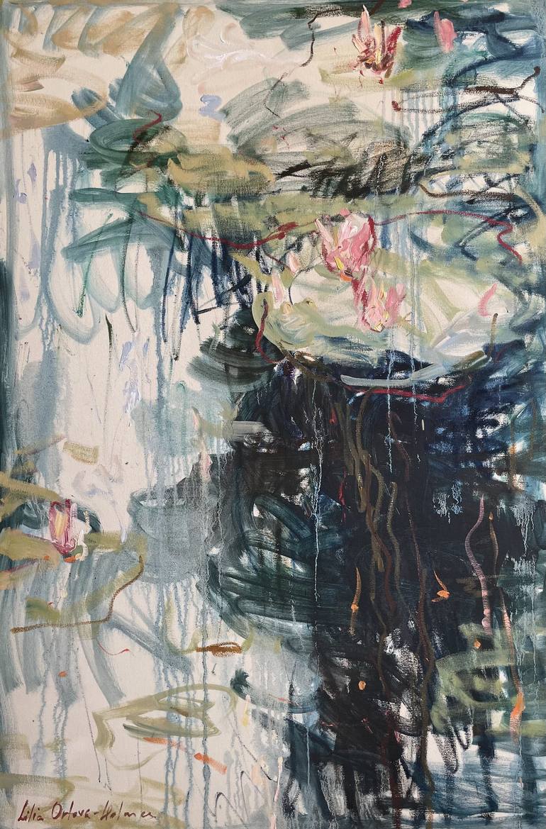 Large semi abstract expressive and gestural painting inspired by Monet, Impressionism and gardens in Giverny. A part of series “Reflections and flow. Dreams of summer in Giverny “