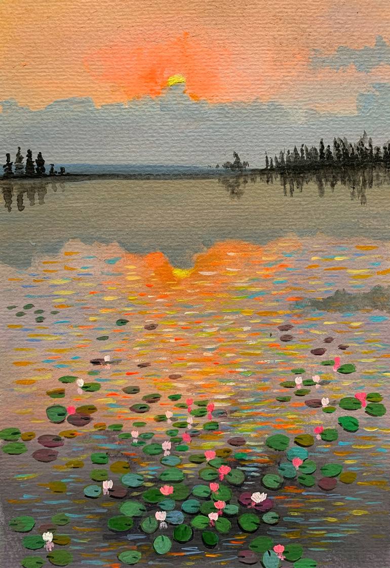 Water lilies pond at sunrise. My water lilies paintings though a bit abstract in nature or sometimes realistic are highly inspired by the great french artist Claude Monet. This is a painting on 300gsm paper and unframed. Painting is protected with a thin layer of varnish. Import Duties/Vat Impo...