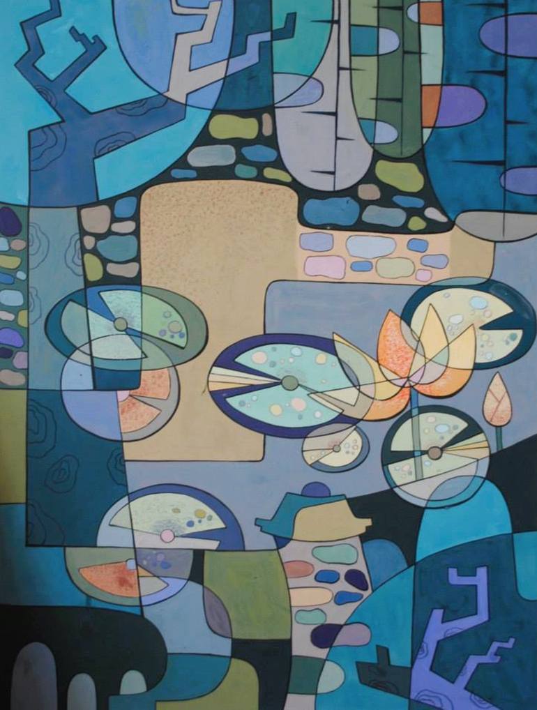 The painting "Water Lily Pond" depicts a pond of blooming water lilies in a quiet garden. The water lilies bloom in a variety of colors, from light pink to dark purple. The lush green leaves float on the water, creating a poetic and peaceful scene. The painting is painted with acrylic, giving it a ...