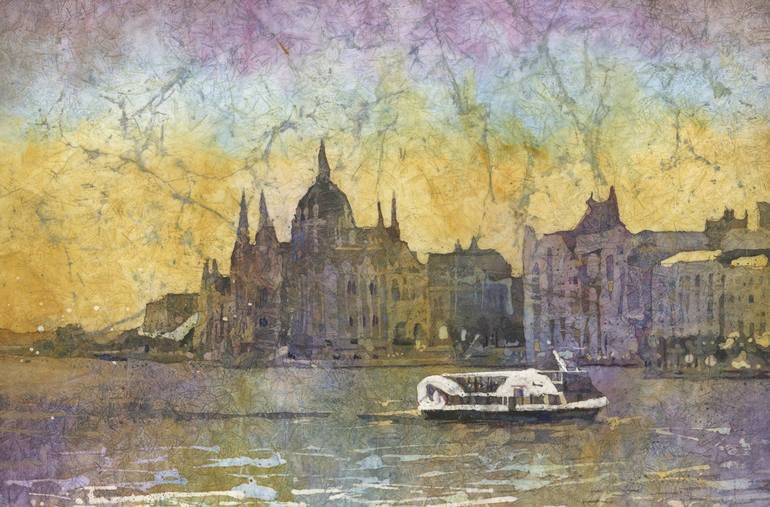 Watercolor landscape Budapest skyline Hungarian Parliament travel essentials, sunset painting batik artwork handmade item travel essentials. Original available (12x16") painted on Japanese rice paper. Hand signed by artist (not pictured). Unframed. Painted by artist Ryan Fox. Ryan Fox is a sign...