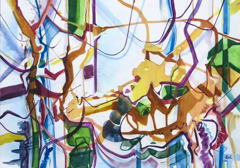 The watercolor presented unfolds like a polyphonic tapestry of colors and shapes, evoking a visual choreography in which each stroke seems to dance with the others. The shapes in this watercolor are fluid and changing, suggesting a constant metamorphosis. There is no fixed center; rather, the compos...