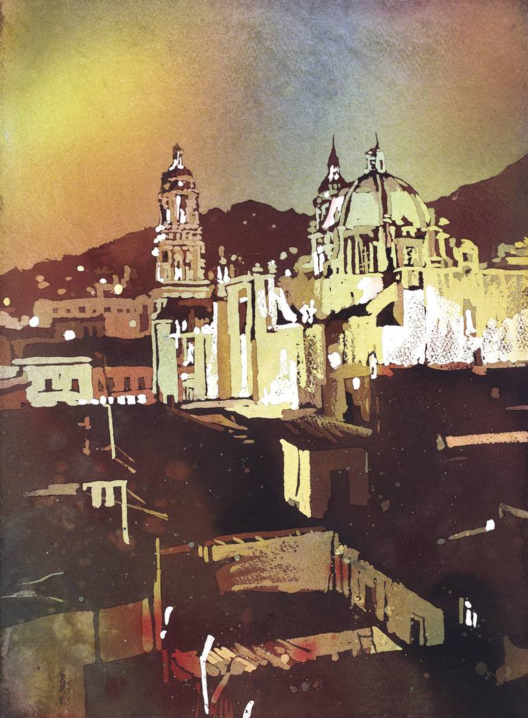 Watercolor painting of Cathedral in the colonial mining town of Zacatecas, Mexico at sunset. Painted by Raleigh, NC artist Ryan Fox. Ryan is a signature member of the American Watercolor Society as well as five state societies- Georgia, Illinois, Pennsylvania, Missouri, and North Carolina (GWS, IW...