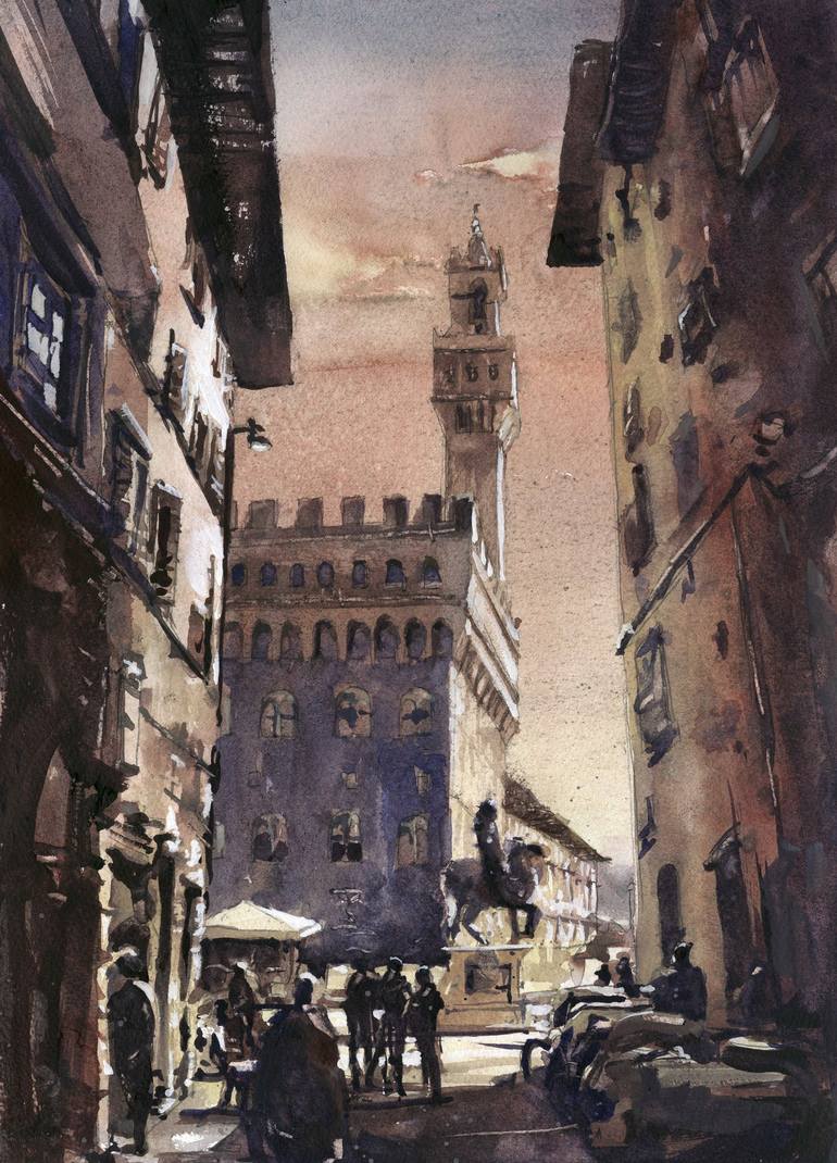 Watercolor painting of bell-tower of Palazzo Vecchio in the medieval city of Florence, Italy. Painted by artist Ryan Fox. Ryan Fox is a signature member of the American Watercolor Society as well as 6 state and regional societies- Northeast, Georgia, Illinois, Pennsylvania, Missouri, and North C...