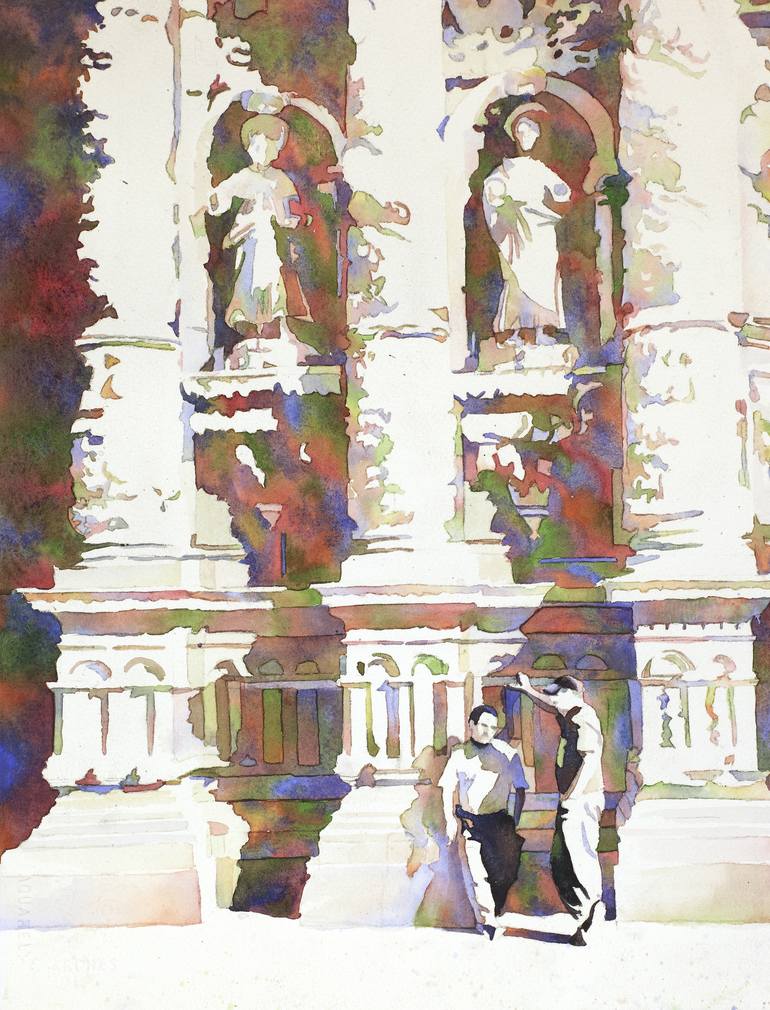 Watercolor painting of men outside of elaborately carved Baroque Cathedral in mining city of Zacatecas, Mexico. Painted by Raleigh, NC artist Ryan Fox- signature member of five state watercolor societies- Georgia, Illinois, Pennsylvania, Missouri, and North Carolina (GWS, IWS, PWS, MOWS, WSNC) Ryan...