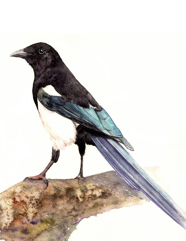The painting depicts a stunning scene of a magpie perched on a branch, with its feathers beautifully glistening in the warm rays of the sun. The colors of the feathers are iridescent, and the artist has used watercolor on paper to create a soft and delicate effect. The magpie is painted in intricate...