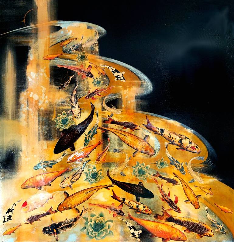 A delicate flow of beautiful Koi fish. In Japan, Koi fish are traditionally symbolic of prosperity and good fortune. Koi and lilies are set to a bold black background, with sweeping strokes of gold and pale blue, and warmth from washes of burnt sienna and nut brown inks. A varnish finish adds textur...