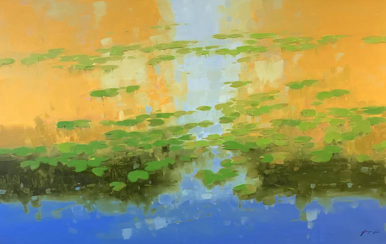 Artist: Vahe Yeremyan Work: Original Oil Painting, Handmade Artwork, One of a Kind Medium: Oil on Canvas Year: 2019 Style: Impressionism, Subject: Waterlilies in Autumn, Size: 42" x 67.5" x 1.5'' inch, 107x171x4 cm, Unframed, Stretched on Wooden Bar, Gallery Wrapped, Ready to Hang. Yeremyan ...