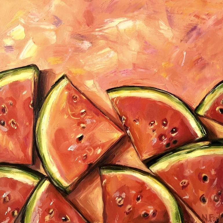 Sunny summer day. Freshly cut juicy watermelons. Sweet and fresh bliss.