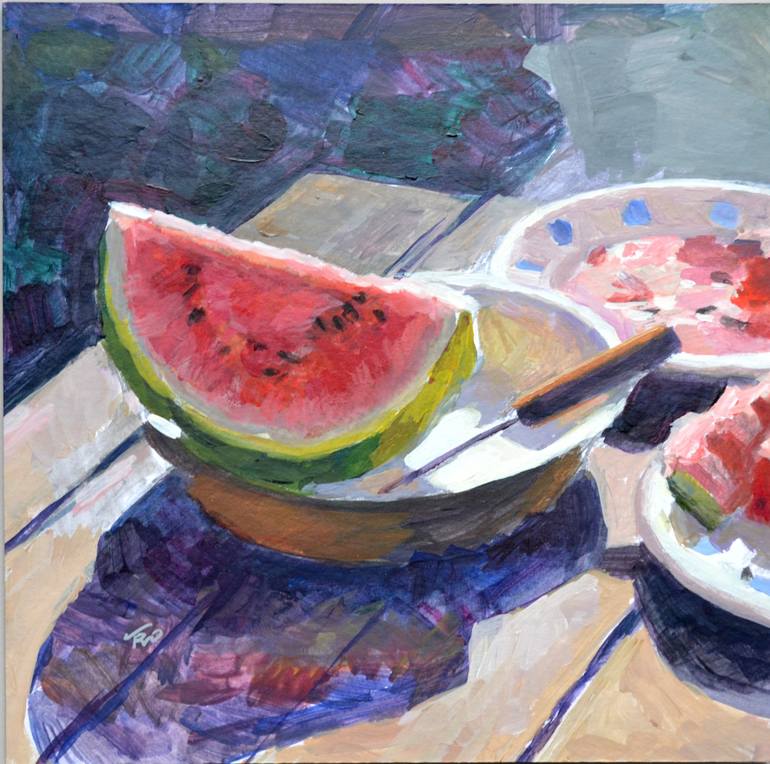 Summer still life with a juicy piece of watermelon viewed against the light, small acrylic painting. This picture reminds of the sunny warm summer days. -Title: Watermelon -Picture size: 15x15 cm / 6x6" -Materials: acrylic, paper -Year of creation: 2021