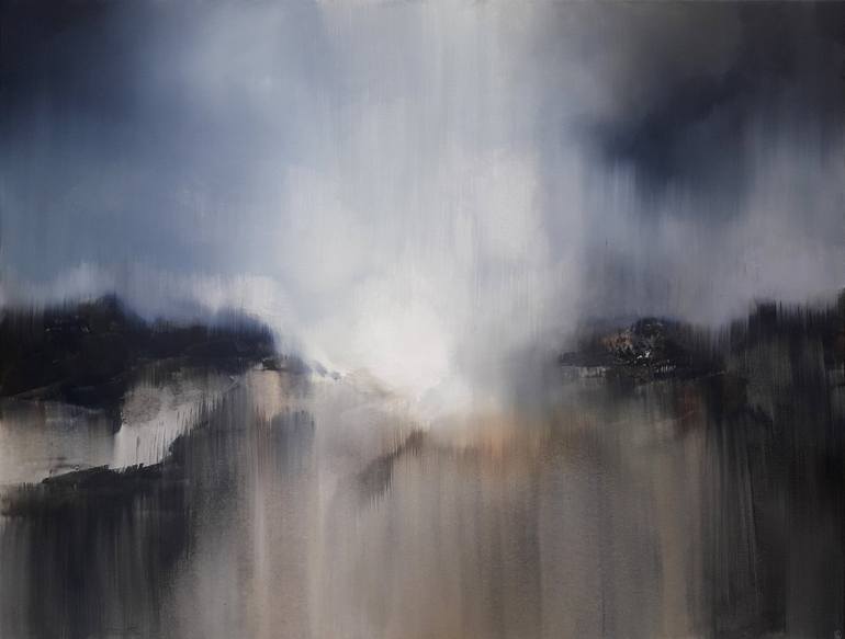 Blurred shapes melted in light appear like cliffs floating between the sky and the earth. I relied on a simple representation of the landscape to formalize the idea of a nature free from accidents, appearing as frozen for eternity. I like to paint a kind of atmosphere with the presence of a diffuse ...