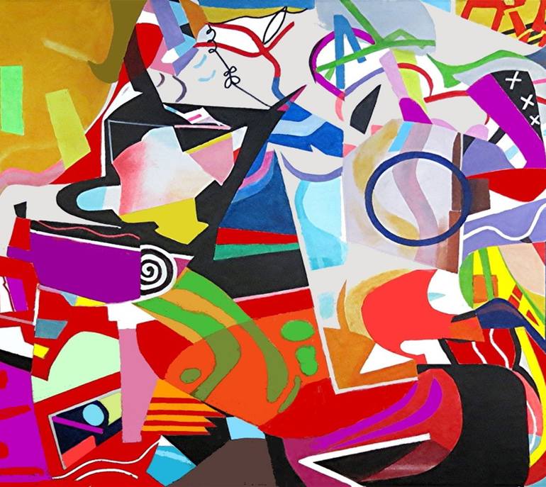 The bird/drone main element of this collage-like, intuitively-designed work suggests someone or something finding a "way out". The painting overlaps the edges.