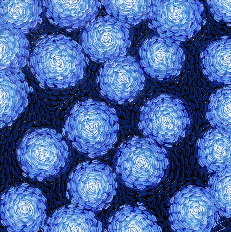 Painting is a mental, physical, and spiritual experience that takes me away to another place and time. I get lost in a world filled with vibrant color, rich texture and swirling movement. When I come back, I bring a piece of that world back with me. I am fascinated with color relationships and I obsessively experiment with the possibilities in each of my paintings. My collectors say my use of color is one of the main reasons they love my work. I paint thick, vibrant, oils on canvas influenced by the color, movement and texture found in the natural world around us. My recent paintings are designed to be hypnotic. I start with a big flowing design that keeps your eye constantly moving and returning back into the canvas. Then I develop more detailed layers that engage on a deeper level. I don’t want you to look away and always see something new each time you view it. Being prolific is something I’m known for. I have a huge body of work that has grown and changed over time. Visitors to my studio are always impressed by the impact of so many of large, original oils. I have my art hanging in businesses, hotels, restaurants, wineries, public buildings, mansions and homes around the world. I have dedicated my life to developing an original technique that utilizes the highest quality paints, canvases, tools and finishing. Although, what I am most proud of is that people say my work makes them happy.