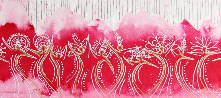Created in red, white, black (the national colors of the Trinidad and Tobago flag) and gold, it is a depiction of the energy of Carnival masqueraders. This painting comes from a unique collection of 20 paintings called Wild and Free Spirits. The masqueraders are portrayed as spirits not defined by r...