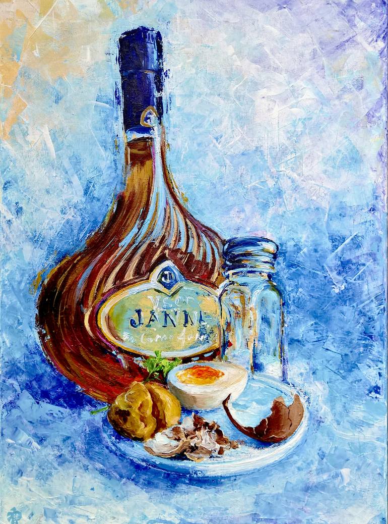 Illogical still life about life in London, where wealth and poverty intersect, chic, luxury and poverty. Cognac symbolizes the wealth of the city, money and opportunities, a boiled egg is a man who is brewed in this city, half of the egg is a part of a person, another part of it in his homeland, a b...