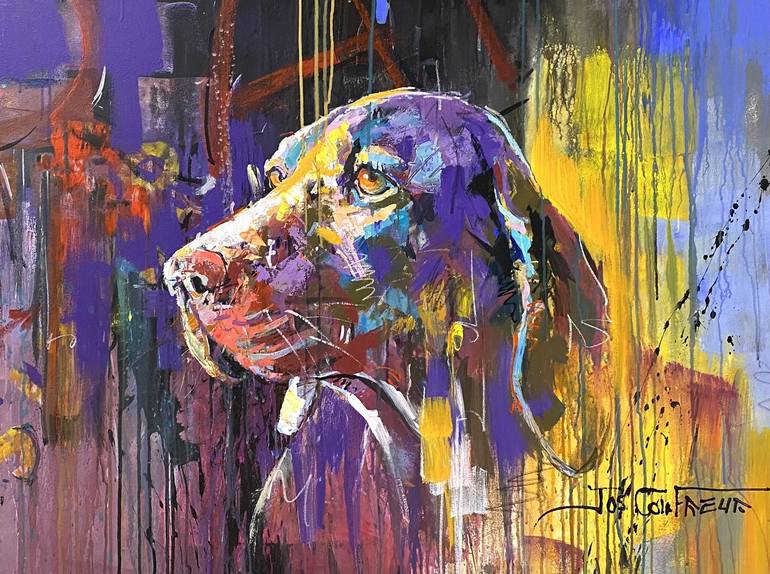 Portrait of a Weimaraner dog. For fun I started with a loose graffiti kind of background. A fresh, modern painting. I paint with large brushes and bold, loose strokes in vibrant colour.