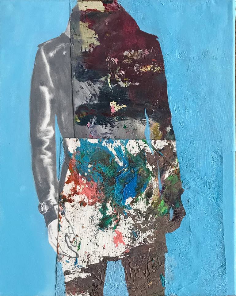 Painted a man wearing a suit. Inside surfaces were painted earlier in last year. Covered this layer with another one (mixed, cold blue) which makes a figure, in this case a man in suit. Also had sticked two canvases on to the main canvas. It makes various expressions of a painting. Interesting sur...
