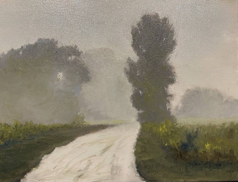 This evocative oil painting captures a view of what I saw on a recent walk. A place I visit nearly every day, this depicts a serene landscape bathed in the soft glow of a misty morning. A winding dirt road disappears into the fog, and that is my way of inviting the viewer to explore the mysterious d...