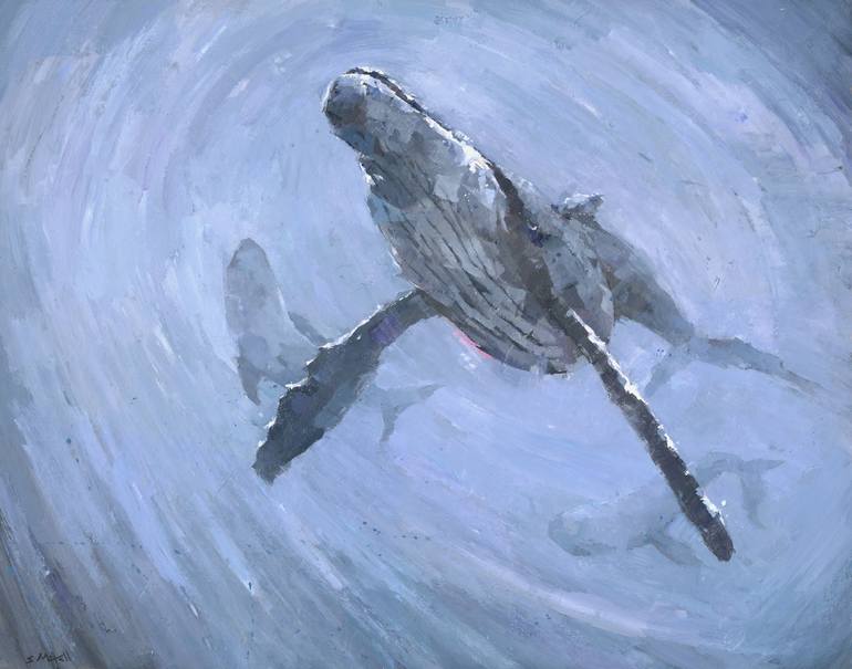 A humpback whale gracefully swims through swirling waters, depicted in soft, muted blues and grays. This is an original, one of a kind, acrylic painting. It is ready to hang in a simple but elegant black stain wood frame, as pictured.