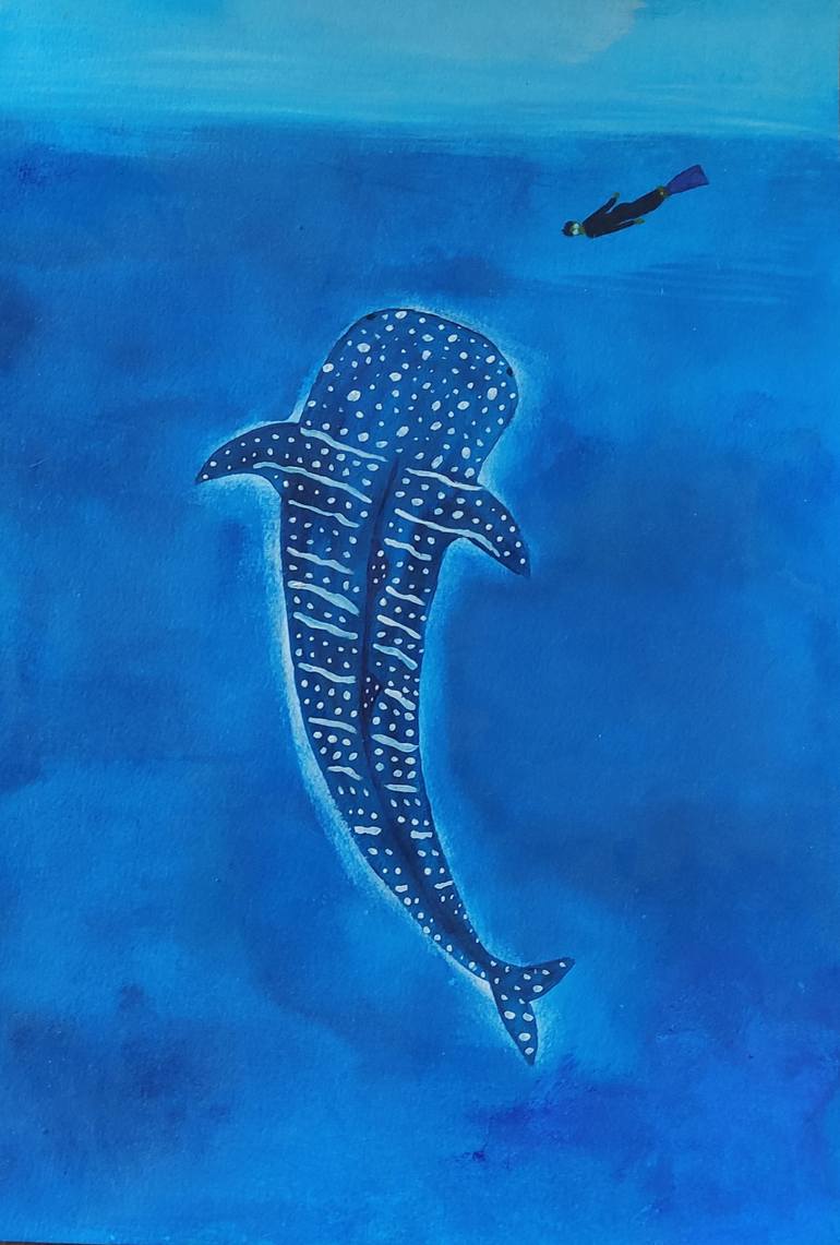 This work is inspired by my admiration for whale sharks ans their beauty, their calm. I wanted to emphasize the size of this animal compared to a human being and to show how small we are compared to Nature in general. I wanted to use intense colours to catch eyes. Nuances of blue. Sea, lakes and wa...