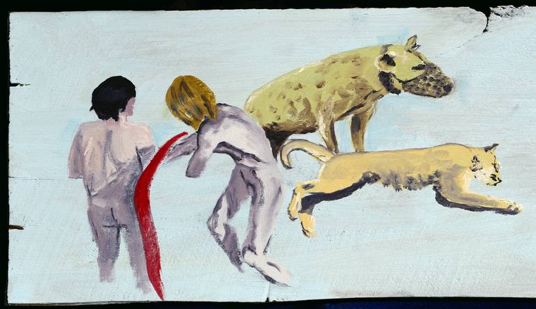 Oil painting on found wooden support. A continued investigation into the human and animal divide, titled using part of a Shakespearean speech from Hamlet. A early adventure into combining elements from found images in mass media.
