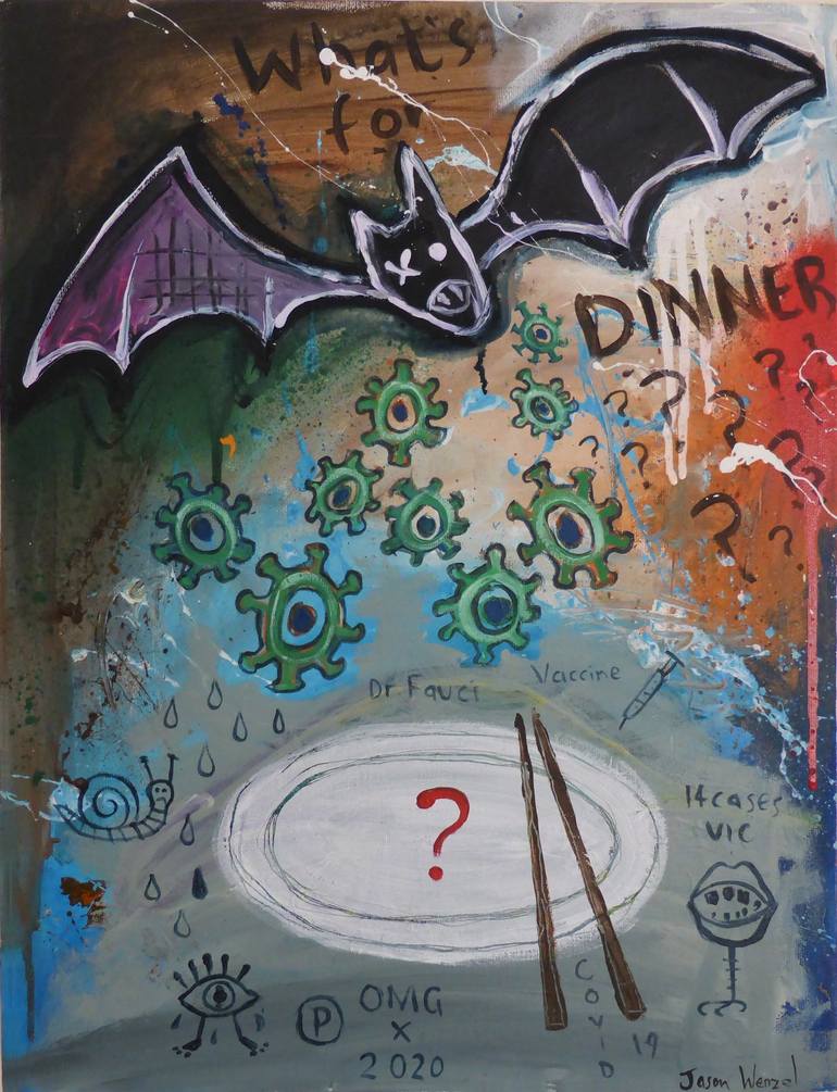 This painting was inspired by the rumours that eating bats (rightly or wrongly) started the Covid 19 pandemic.