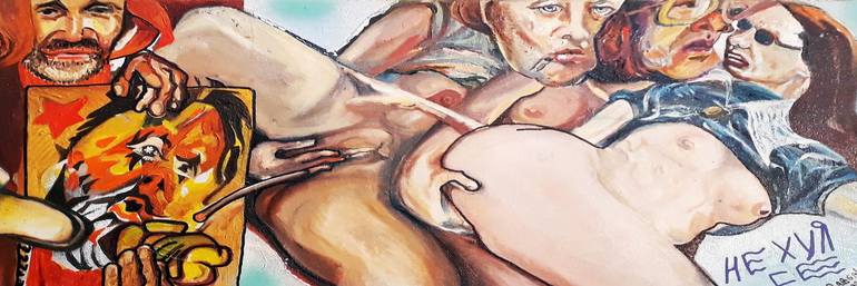 Hei so how did we get there ? Personages: Andrej Babenko Sergei Shnurov Putin Kim Jong-un Angela Merkel Various experts, analysts, and others have described the crisis as a close call to a third world war, while others have suggested the contrary. What the fuck.....! Oil and spray paint on canvas.