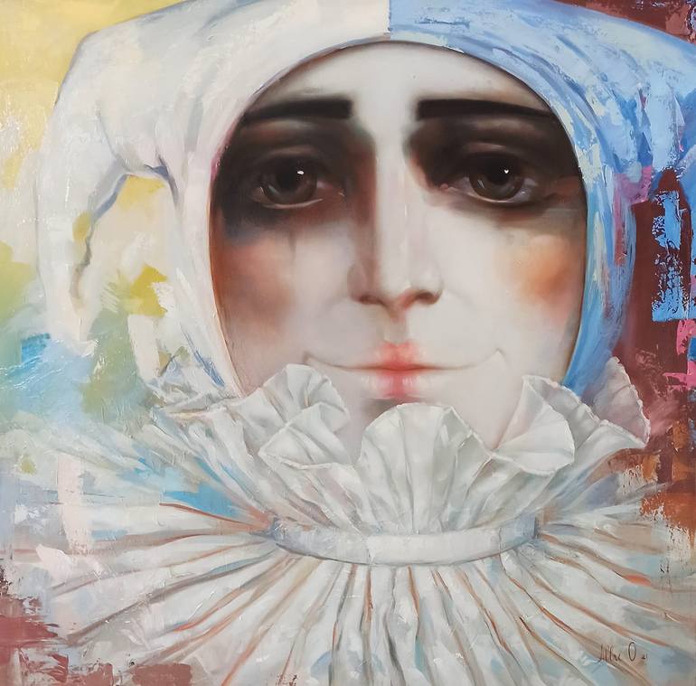 Painting "When all life is in makeup" is painted on canvas in oil This is a portrait of the well-known funny theatrical character "Harlequin", who is always cheerful and playful for everyone, but the erased make-up like a fallen veil reveals his true essence, his sad and mysterious gaze conducts a c...