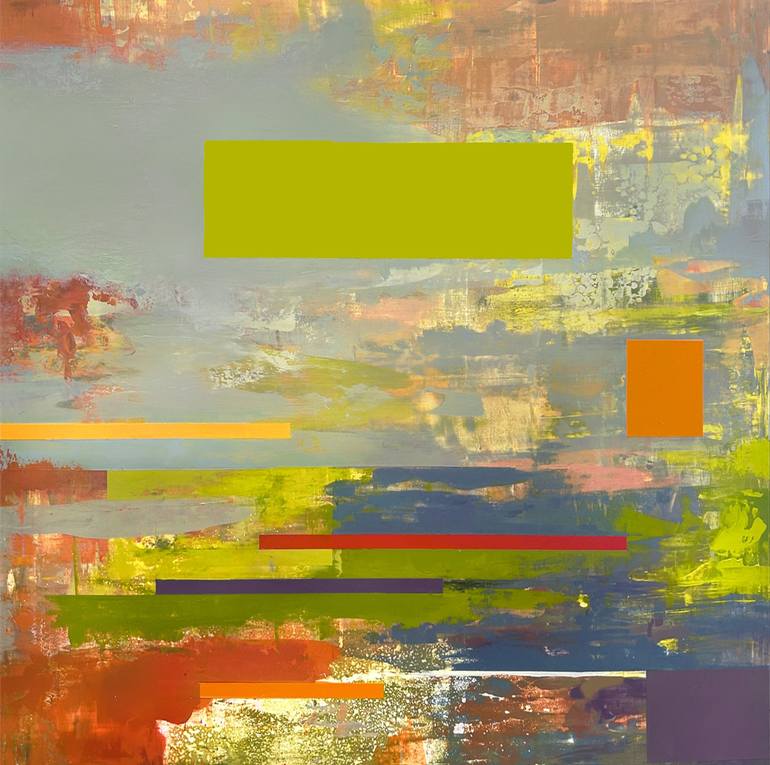My work is an exploration of the contrast between organic textures—created intuitively—with carefully crafted flat, hard-edged shapes. This piece began in response to the eerie orange sky that enveloped New York in early June 2023, as a result of raging fires in Canada. As much of my work, it both r...
