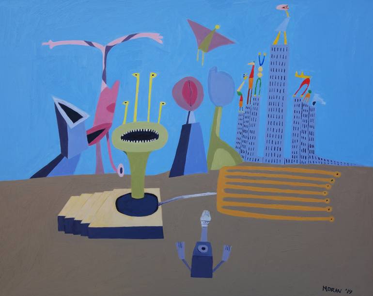 The land of nowhere. Waiting, flying, and dancing, They cast no shadows. The painting's surface is gessobord (cradled masonite). This painting is not framed.