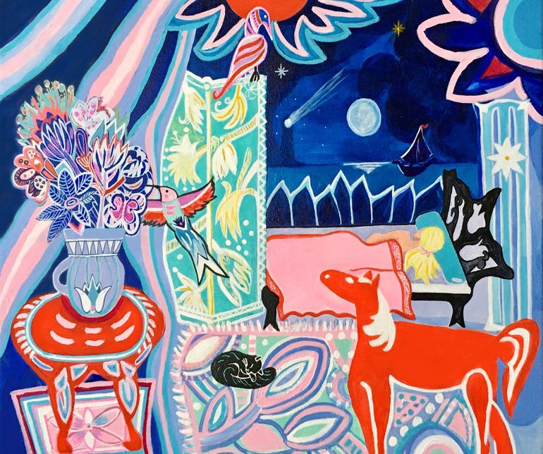 A summer night, in a peaceful bedroom with a view. The cat sleeps on the rug..while dreaming all imaginary creatures visit us.. The sides are painted, so there's no need to frame it. Ready to hang! Signed on the back.
