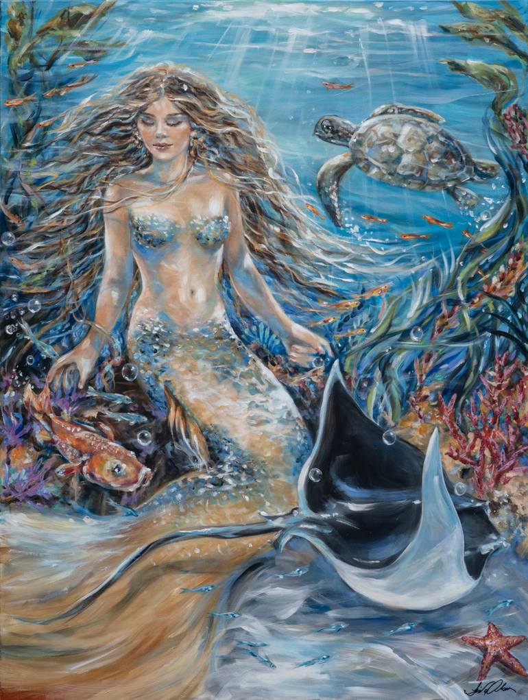 While this mermaid sleeps, fish and sea life swirl around her. A sea turtle and ray join the many fish keeping her safe.