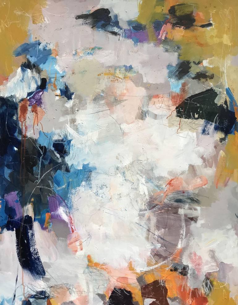 This large, statement painting has been built over many thin layers of paint and grew out of a slow process. The starting point for this piece has been the colour scheme. Its palette attempts to capture a mood of lightness and playfulness. I enjoyed bold brush strokes and more detailed mark making ...