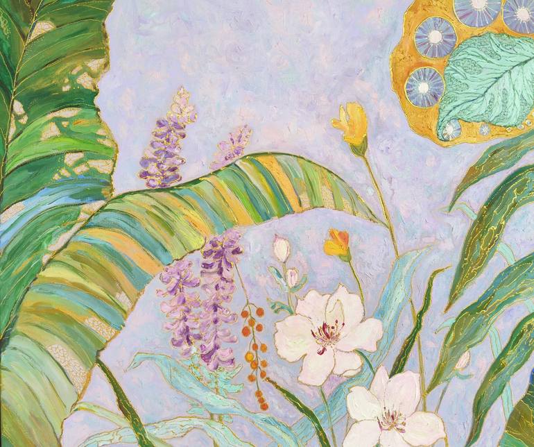 Whispers of Bloom captures a serene yet vibrant tropical scene brought to life with layers of textured oil and gilded gold accents. Banana leaves stretch gently across a soft lavender background, cradling delicate white orchids, yellow blossoms, and sprigs of lavender-like blooms. Shades of teal, em...