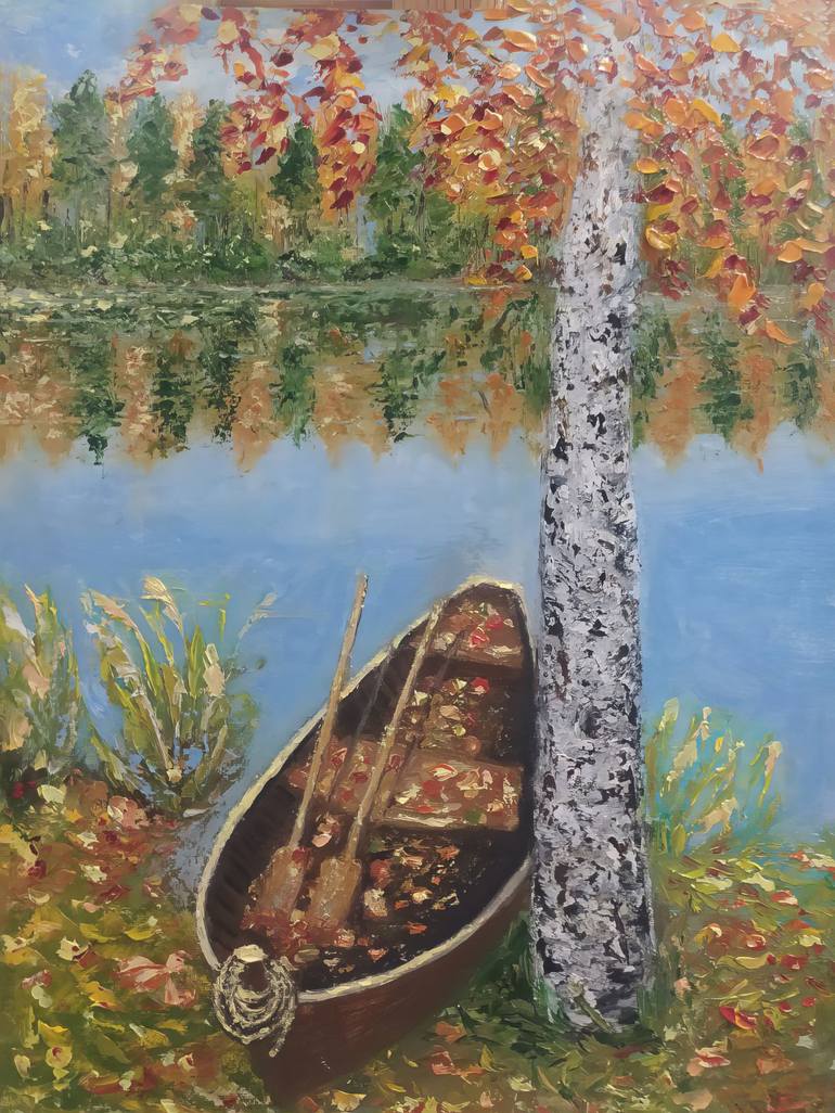 The painting draws you in with a serene, almost nostalgic vibe that seems to breathe life into a quiet lakeside scene. The boat, weary and resting, cradles fallen leaves as if holding onto secrets of the past. The artist’s use of texture stands out, especially in the bark of the birch tree and the w...