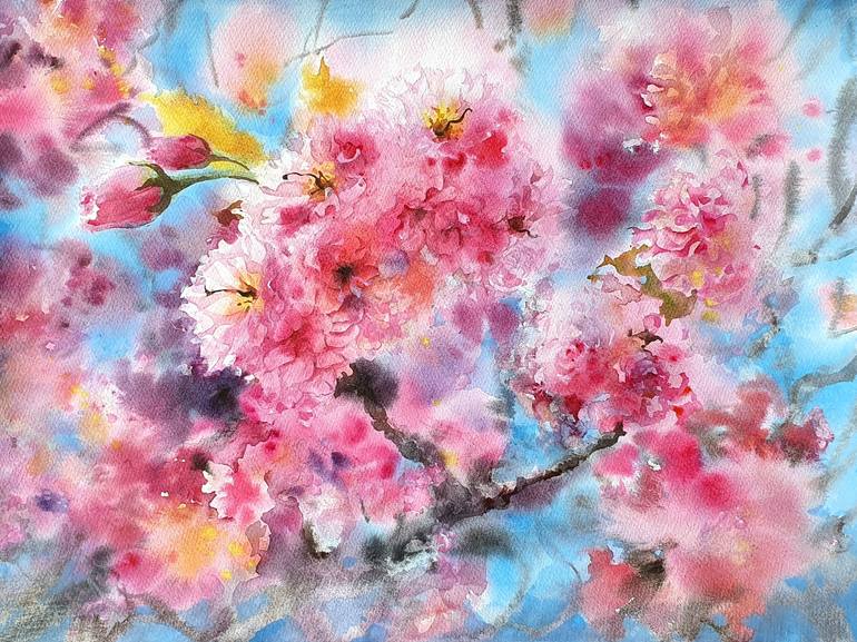 In this enchanting watercolor painting, delicate cherry blossoms dance against a backdrop of vibrant cerulean blue sky. Each blossom exudes a soft, ethereal quality, as if swaying gently in a whispering breeze. The translucent petals, tinged with hues of blush pink and creamy white, create a captiva...