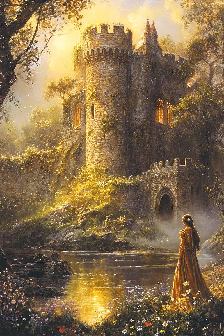 Whispers of the Enchanted Keep The maiden stood at the water’s edge, her silk robes stirring in the breeze. Before her, the ivy-clad castle rose from the heart of the enchanted forest, its towers bathed in golden light as the sun dipped low. The lake mirrored its splendor, rippling as a silver fish...