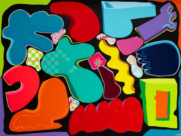 The artwork titled “Whistle in the Dark” is a captivating abstract painting that exudes vibrant energy. The piece features a bold and contrasting color scheme. Fiery reds, electric blues, and vivid greens collide against a dark background, creating an intense visual impact. Organic and geometric for...