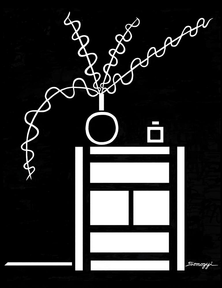 Inspired by a corner of my own bedroom, this is an abstract, minimalistic, black-and-white rendition of a chest of drawers/dresser containing not only a perfume bottle but also a round vase with a long narrow neck containing stems wound with graceful swirly vines, all done in white on a black backgr...