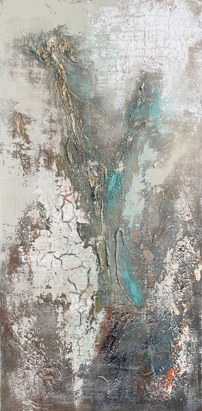 White Crackles is an acrylic on canvas that invites viewers into the realm of modern abstract art, where cracked textures and dynamic forms converge.In this piece, I've layered acrylics, spray paint, sand, plaster, and golden leaf to evoke a feeling of both decay and rebirth. The crackles and textur...
