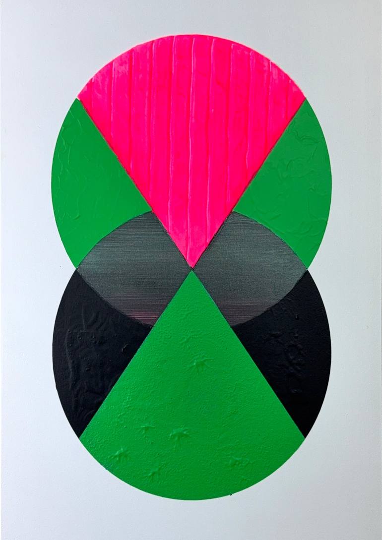 "White Geometry 4" explores the interplay of bold geometry and vibrant color. This painting invites viewers into a realm where form and texture converge, balancing minimalism with striking intensity. The fluorescent pink and green elements create a vivid contrast against the black and white componen...