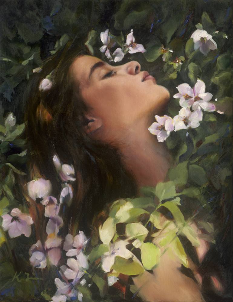 I painted this piece to capture a quiet moment of surrender to nature. The figure rests among blooming white flowers, her face lifted toward the light as if absorbing the warmth and stillness around her. I wanted the soft petals and lush greens to echo her calm, creating a sense of harmony between t...
