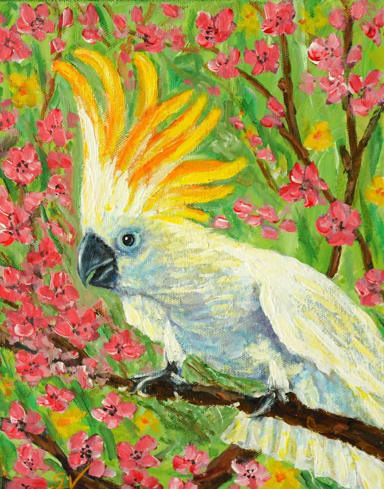 This original painting, captures a moment of serene beauty, blending the elegance of nature with the intrigue of a curious creature. Galina's impressionistic and realistic style brings the scene to life. The white parrot, the focal point of the composition, has a keen, inquisitive gaze. Its posture ...