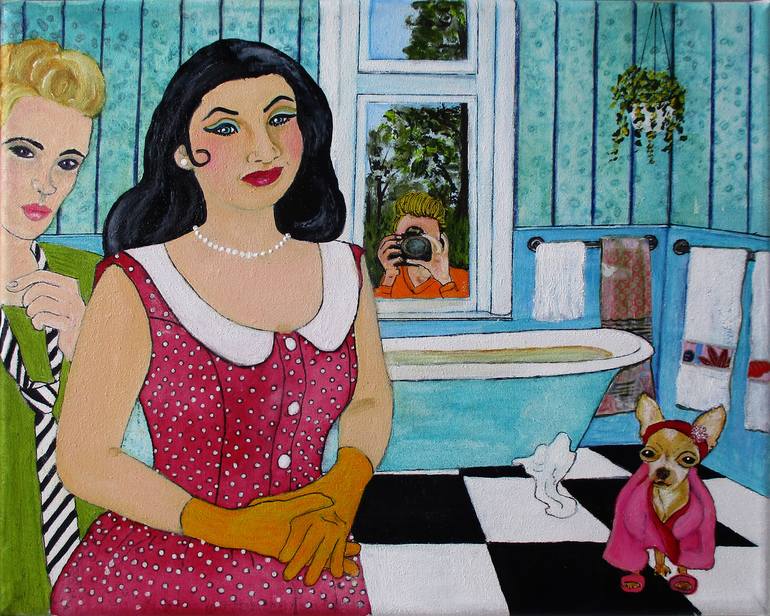 The most important element in anything I create is color and its relationships. My figurative work appropriates and juxtaposes imagery and ideas from American culture. My imagination is stimulated by what I see and hear on the internet. My paintings are sometimes parodies depicting scenes that can be suggestive, ambiguous, and disconcerting. Favorite settings for these scenarios are bathrooms, kitchens and hotel rooms. Common motifs are checked floors, cigarette holders and cigarettes. I enjoy using irrational perspective and color for value. Figures in my paintings are often self-consciously staring out at you the viewer thereby including you in a scenario whose meaning is created in your mind, based upon your unique world/societal perspective. Most of my paintings are small in size and intended for small, intimate spaces. Since receiving a BA in Art from the University of Hawaii-Hilo, my artwork has been exhibited in solo and group shows in the United States; Amsterdam, The Netherlands; Paris, France; London, England; and is in private collections in 50 states and 16 countries. Favorite mediums are oil, acrylic, watercolor, and ink.