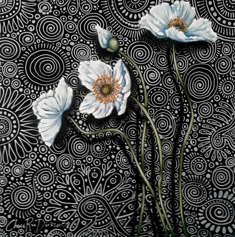 I am captivated by poppies with their intricate, delicate petal and stamens. They never cease to draw my attention in and make me wonder about intelligent design...or more, make me laugh at those who dispute it. My trademark gold and silver spiral backgrounds represent the life-force energy that s...