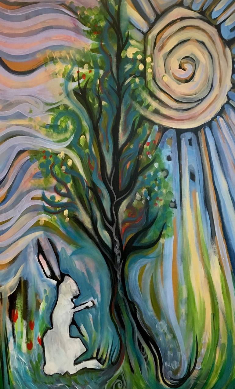 'White Rabbit' - By Cherianne Dawn B.A (Hons), MioEE " This is a big acrylic painting on wooden panel, with very flowing bright colours. I find this type of painting incredibly therapeutic, I love painting the long smooth lines and seeing the colours blend in parts, and flow over each other in othe...
