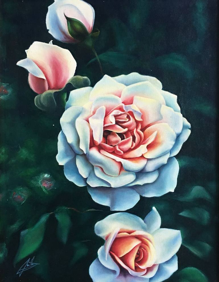 White Roses is a traditional painting and one of my very early works. I still have it, and have decided to sell it. I studied fine art, and impressionism in my early days as an artist, and this is is from that period. It is still framed in its original frame.