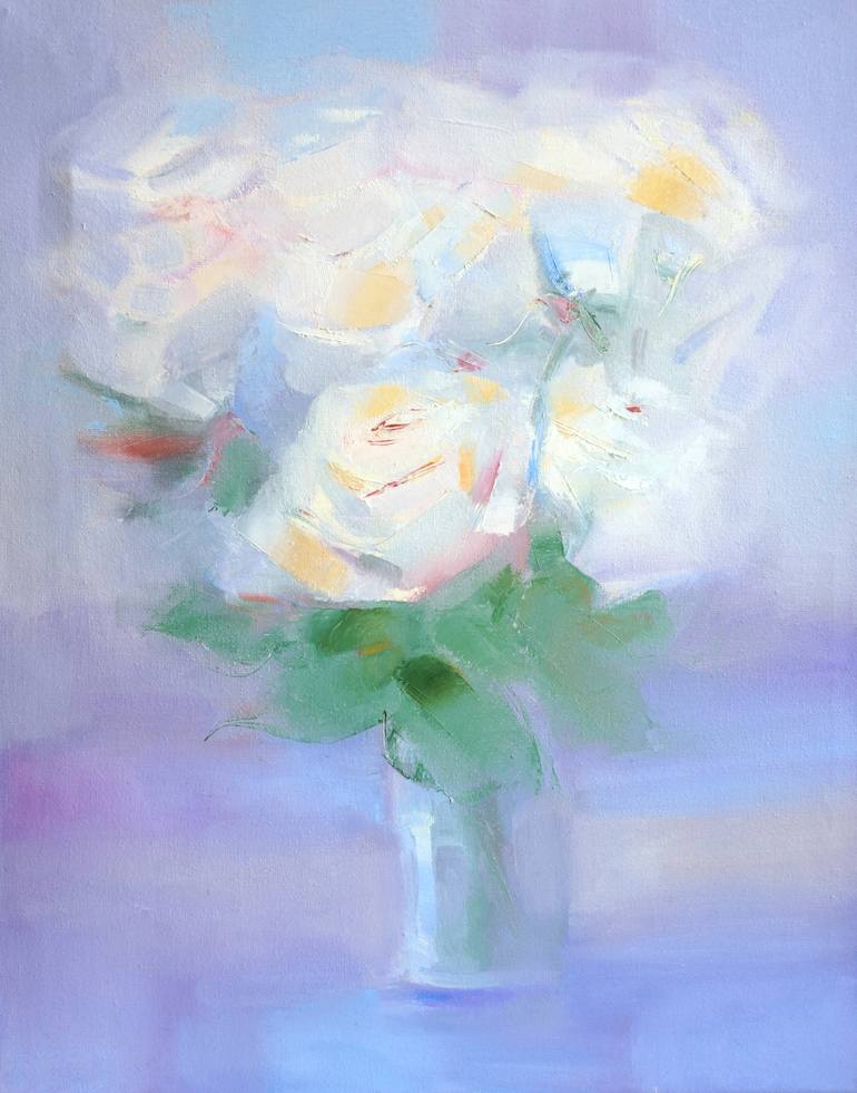 Painting: Oil on Canvas. White Roses Light Bouquet Painting: Oil on Canvas